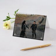 Even after the celebration is over, your thank you cards will continue the theme of fated, star-crossed lovers. These cards feature a photo of you and your new spouse from the big day, surrounded by a frame of rising suns and stars in a glittering foil.