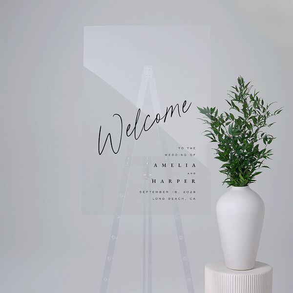 A heartfelt message welcoming guests appears in a flowing script at a slightly angled tilt on these elegant welcome signs. Your details, including names, wedding date, and event location are neatly arranged along the bottom right-hand corner of the design. A solid background provides a clean backdrop that keeps the focus on the typography and personalized details.