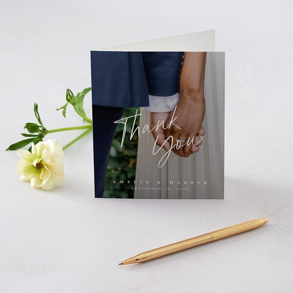 This romantic card displays your names, wedding date, and the phrase "Thank you" in a blend of elegant and script-style fonts. As a personal touch, the typography appears against your best-loved wedding photo.